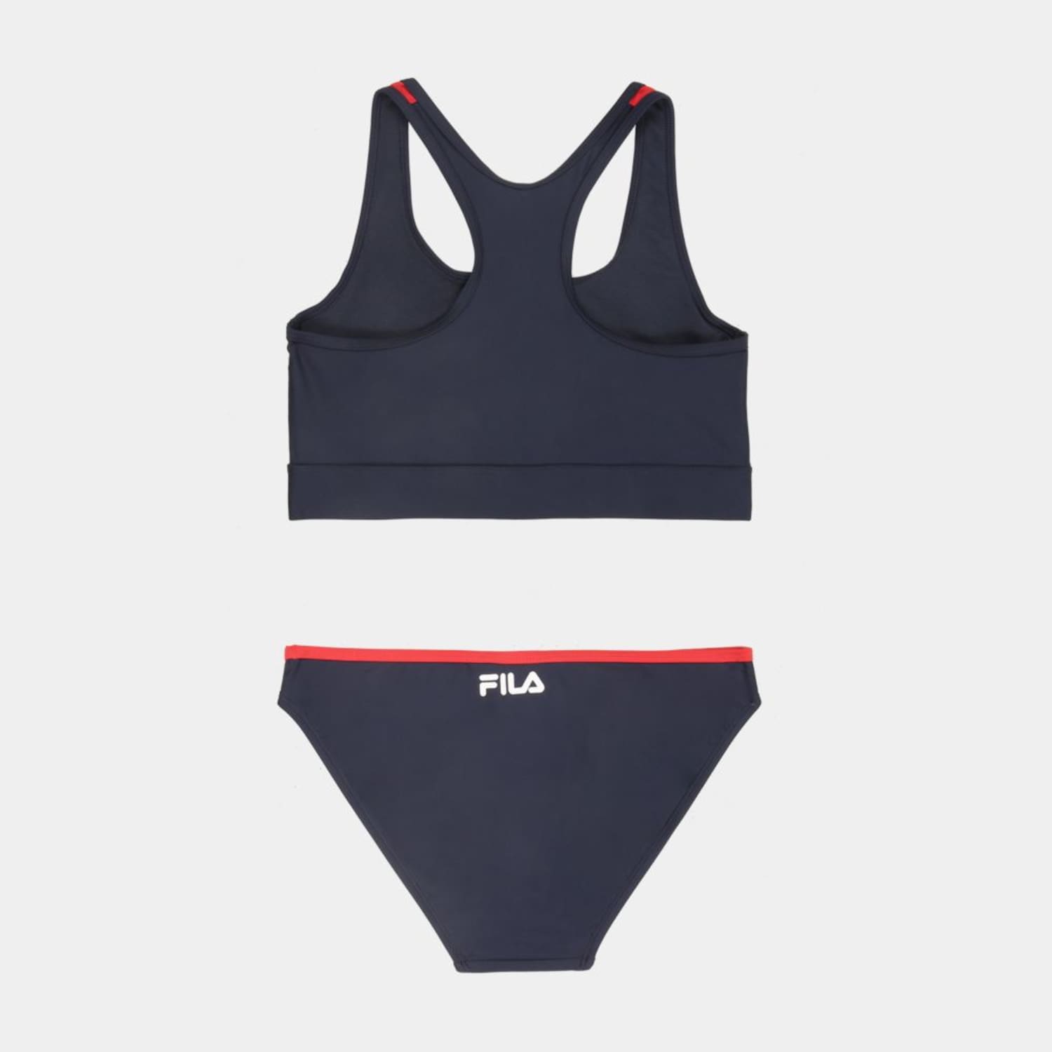 A zipped Fila bikini with binding in contrast colour and a big fila logo at chest splitter into left and right side and the bottom with binding as well and a fila linear logo at back
