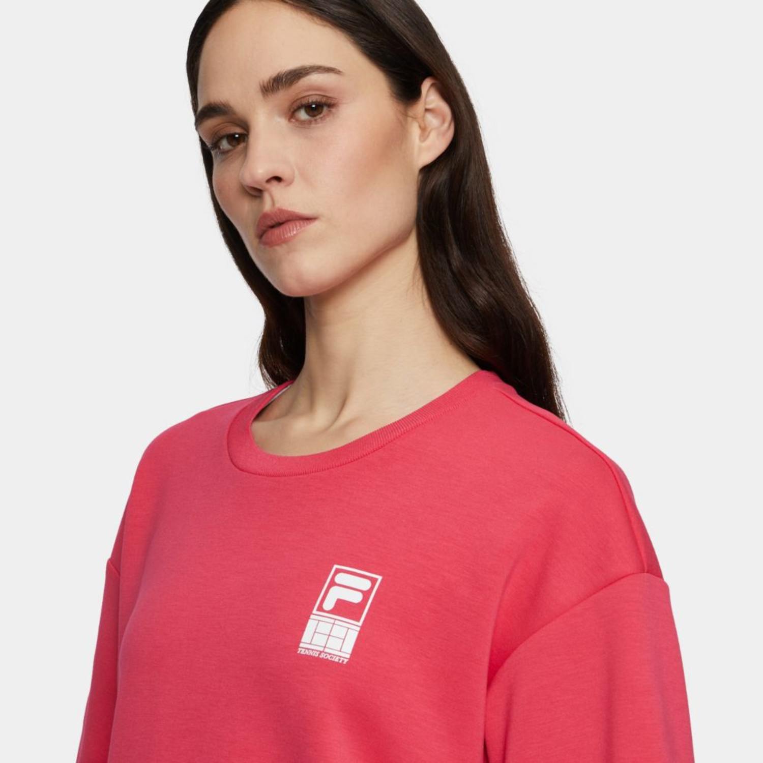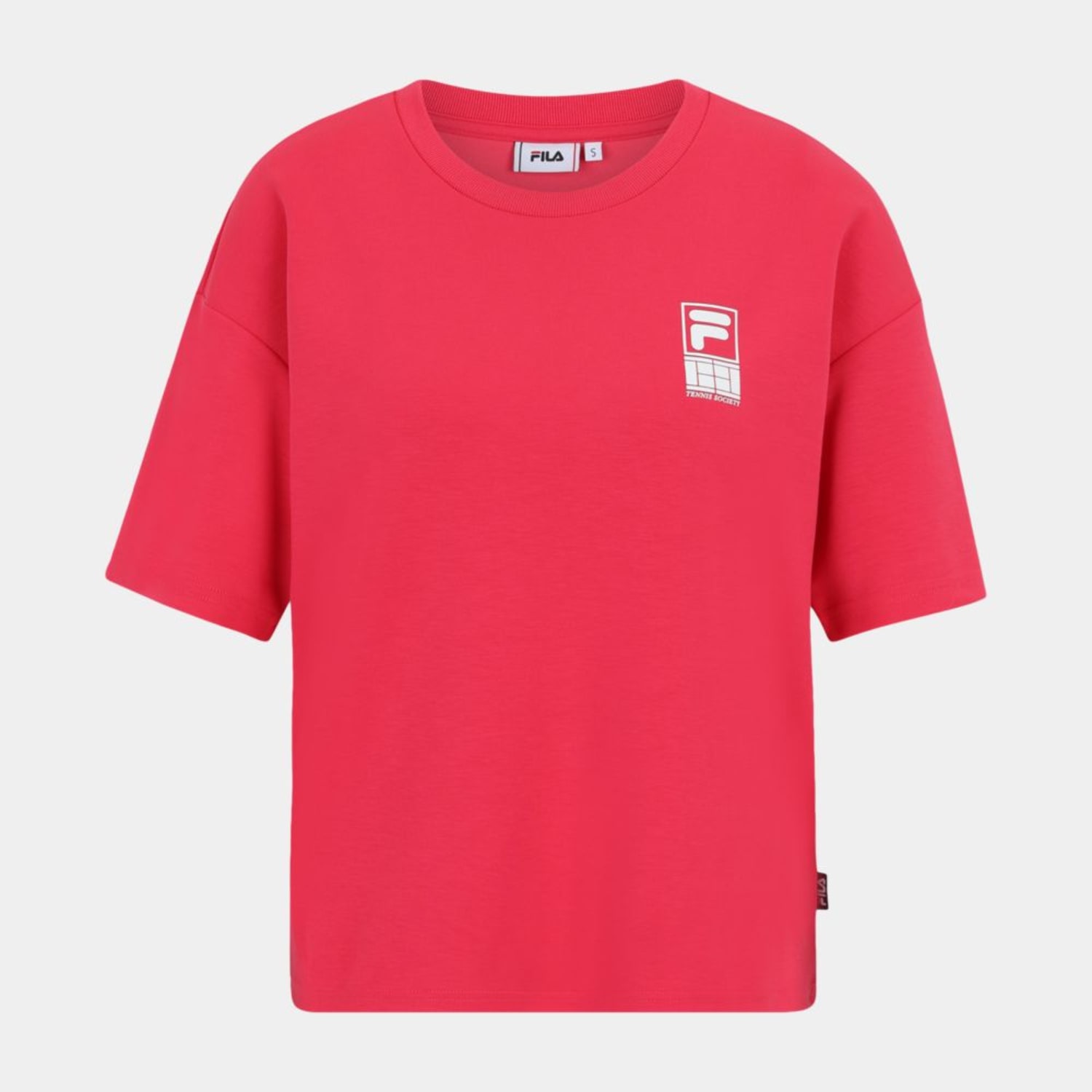 Loose fit tee in a viscose blend interlock quality. The tee has a printed F-box tennis society graphic at the chest, and branded with a Fila linear logo flag label at lower left side seam.