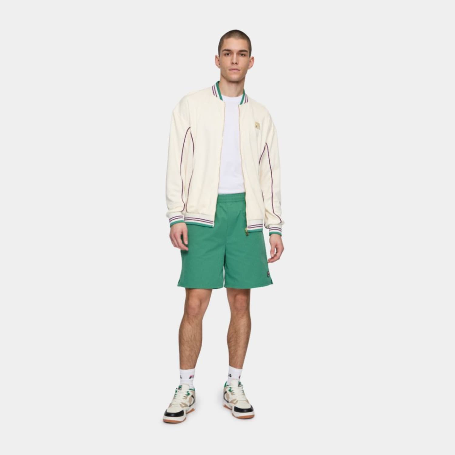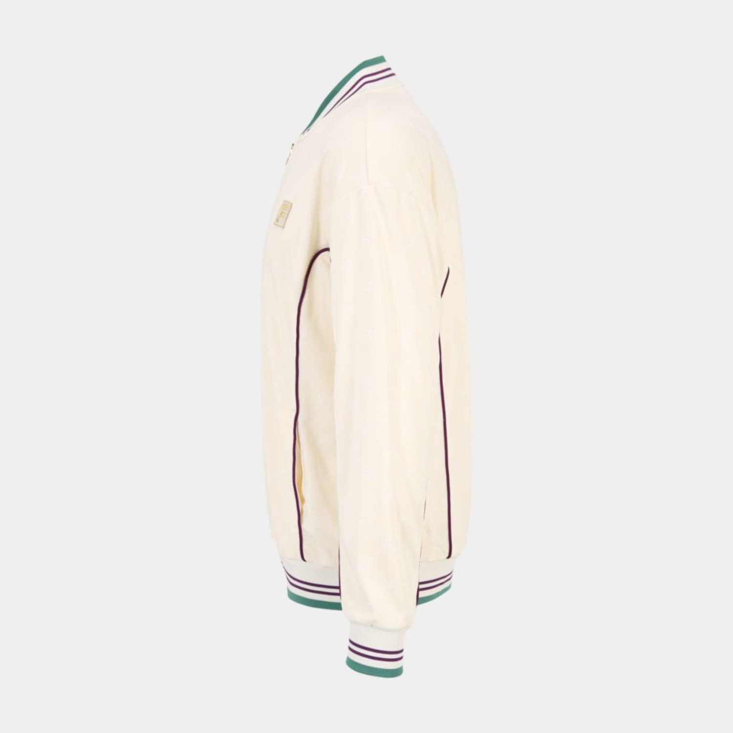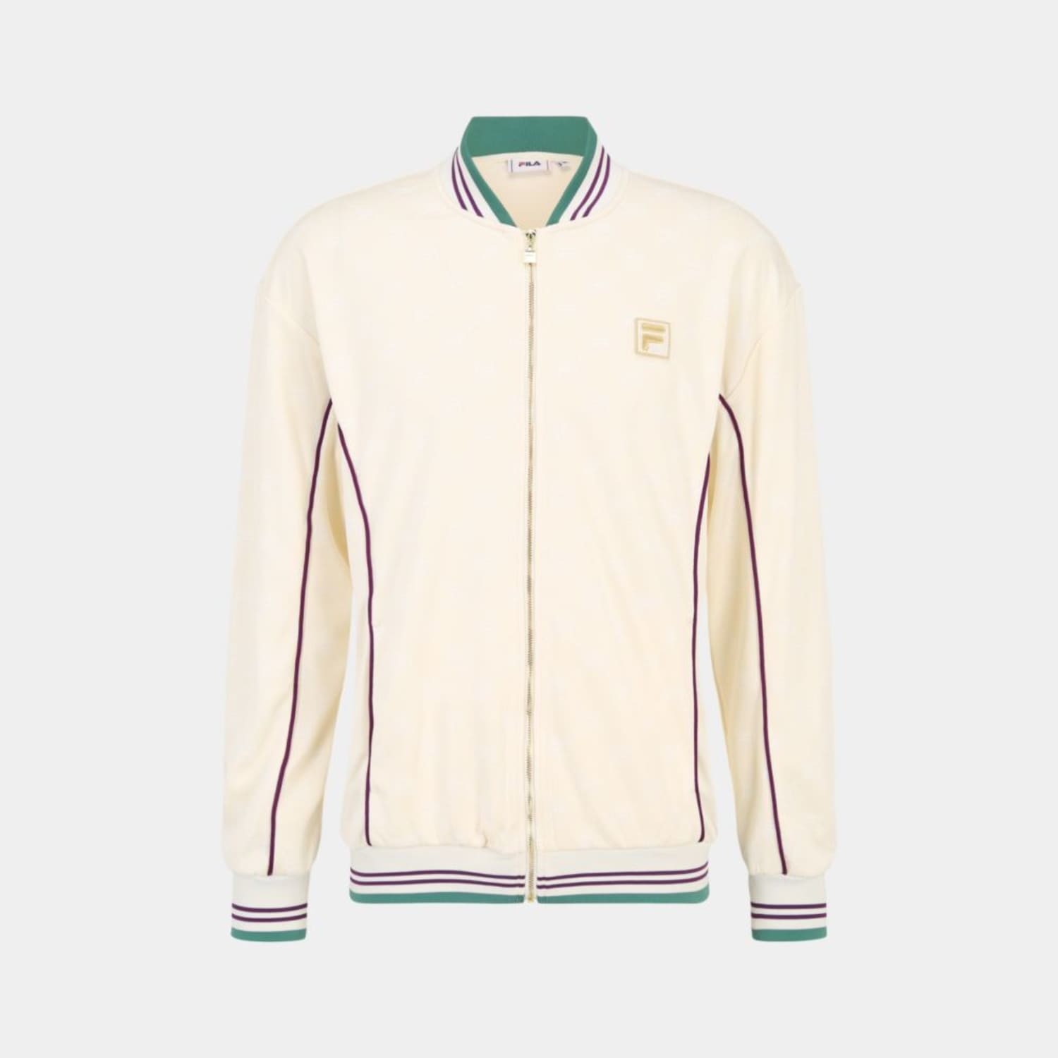 Oversized track jacket in a jacquard monogram fabric. The jacket has knitted rib collar and cuffs with contrast color stripes, piping details and a golden metal zipper at front. It is branded with a golden Fila F-box badge.