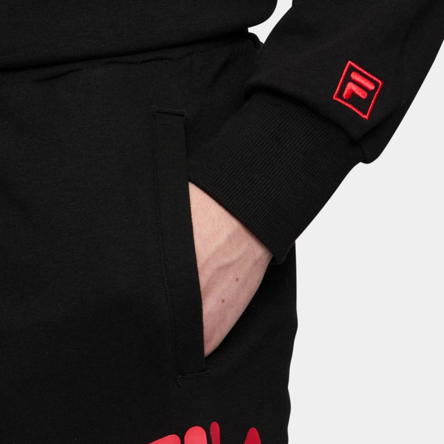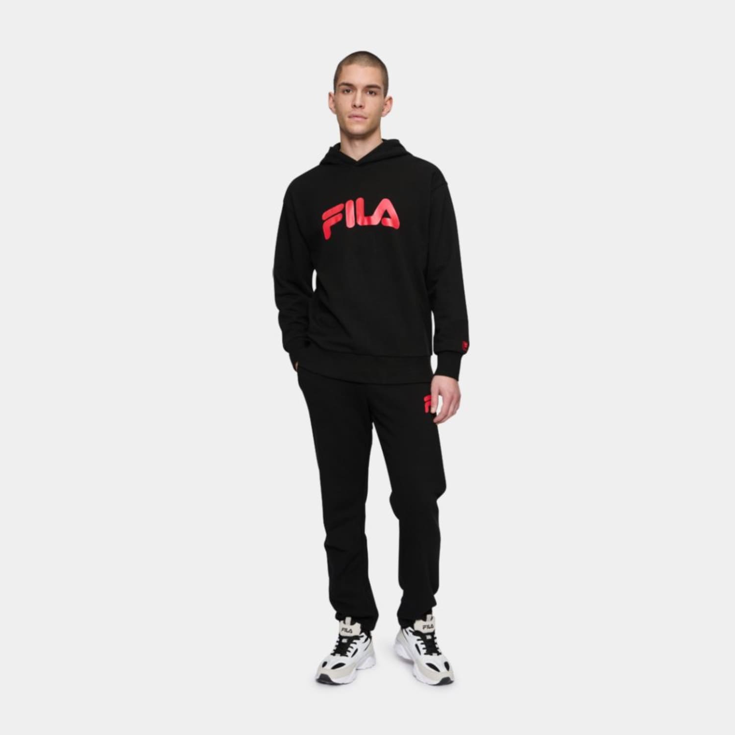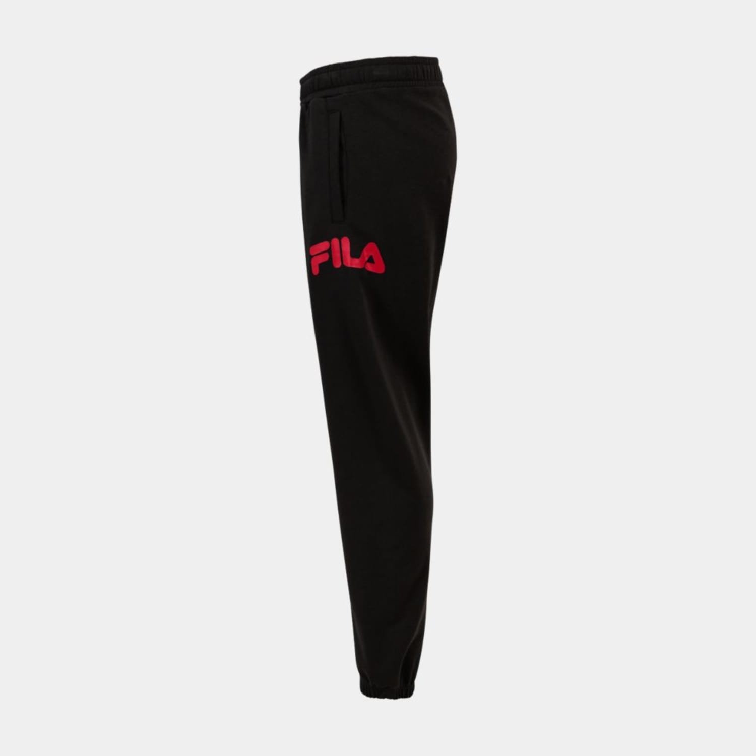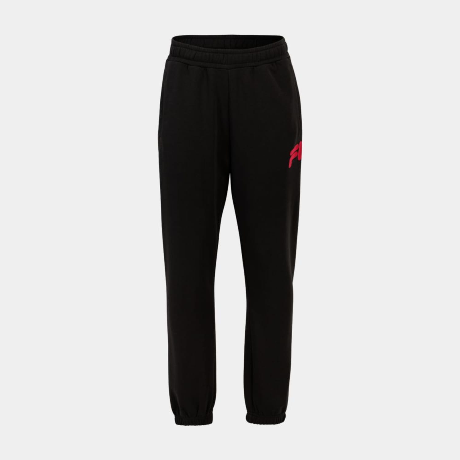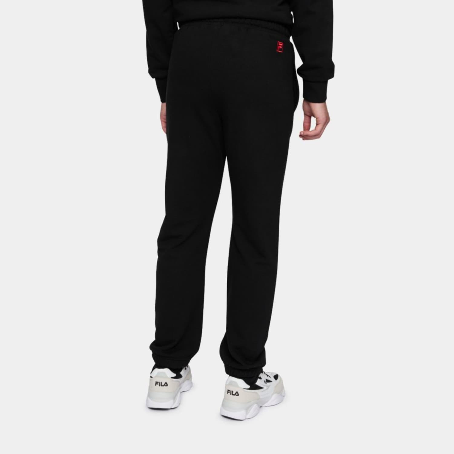 Loosely fitted sweat pants made out of a cotton blend french terry quality. The pant has an adjustable waist and elasticated cuffs and are branded with an arched Fila logo at left side leg and an embroidered Fila F-box logo at back.