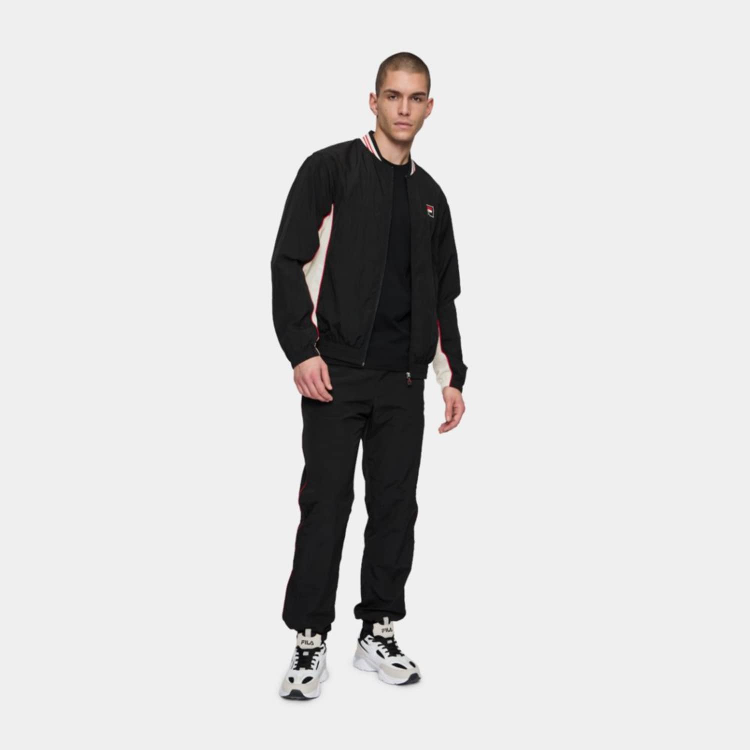This regularly fitted track pant is made in a thin crinkled nylon quality, with a thin mesh lining. The pant has pockets in side seams, an adjustable waistline and a contrast color piping runs across the side seams of both legs. The pants are branded with a Fila F-box embroidery at the front of the left leg.