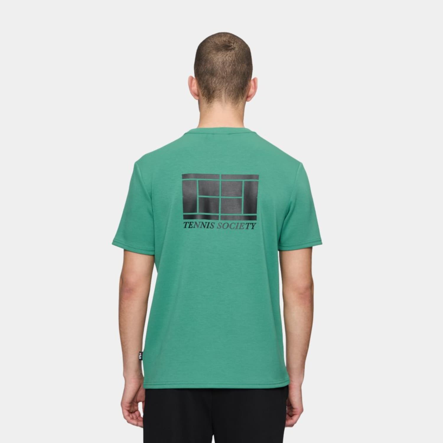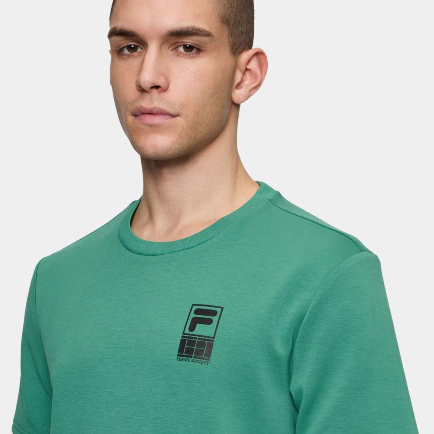 Regular fit tee in a viscose blend interlock quality. The tee has a printed F-box tennis society graphic at the chest, and a larger print on the upper back. A small Fila flag label is attached in the left side seam.